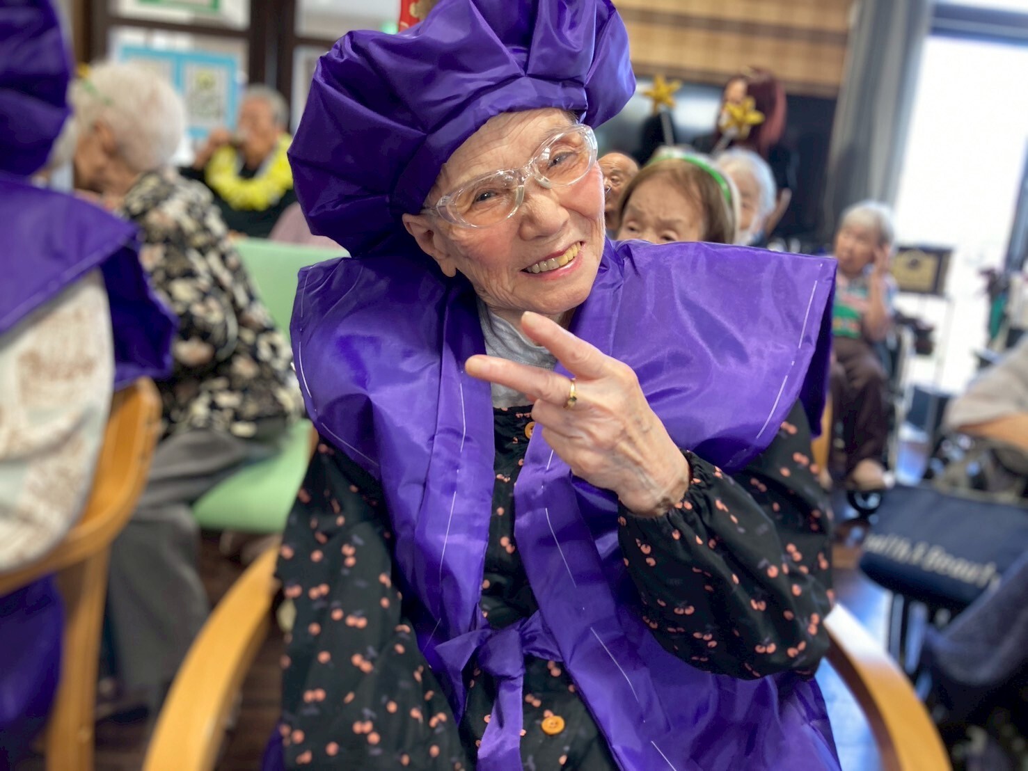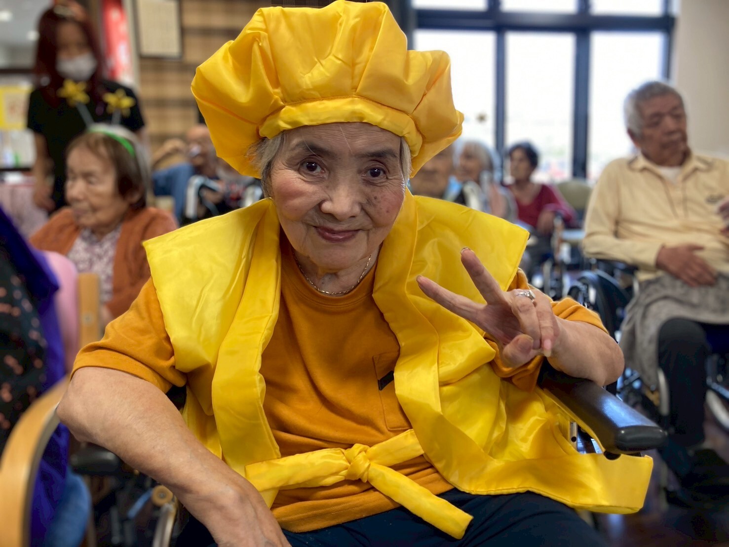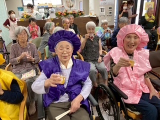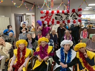 デイサービスからの出し物はチンドン屋でした。スタッフそれぞれ普段と違う格好をし音のなるものを持ち利用者ぐるぐると回らせて頂きました。皆さんとても楽しそうにせれていて笑顔がたくさん見れました。