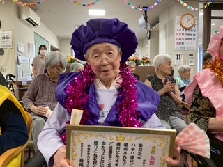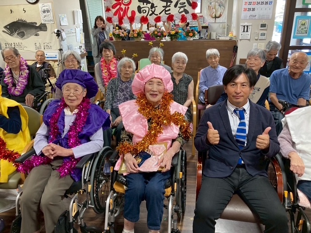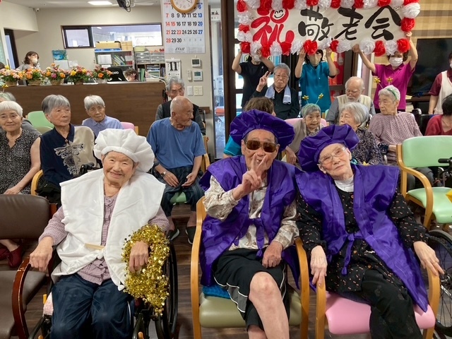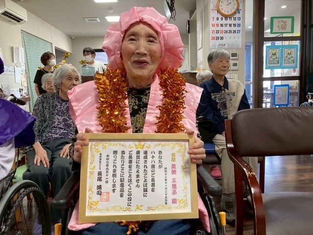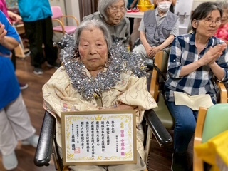 今年の長寿者は7名いらっしゃいます。7名の方々それぞれお祝いの賞状をプレゼントさせていただきました🎁そのうち百寿(99歳)の利用者様より長寿者代表としてとても素敵な挨拶をして頂きました。