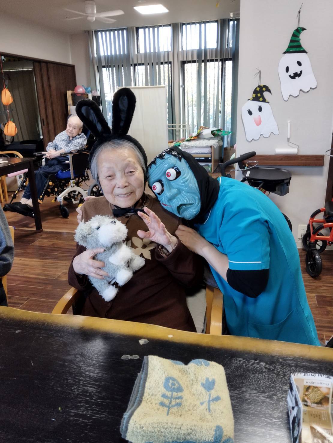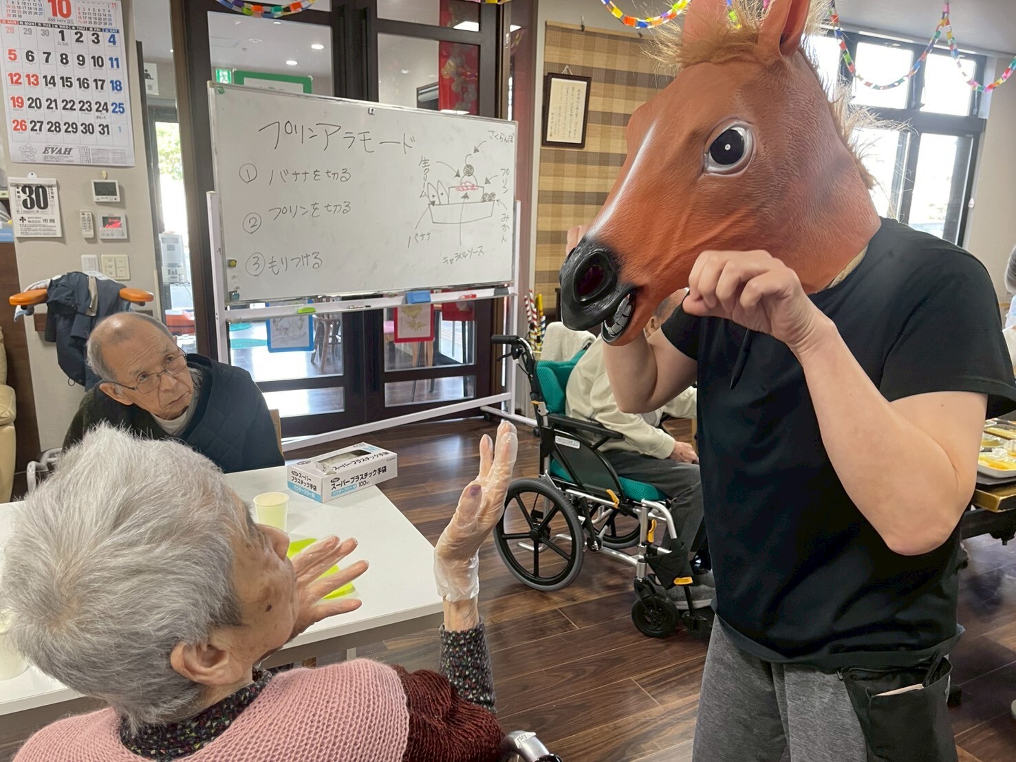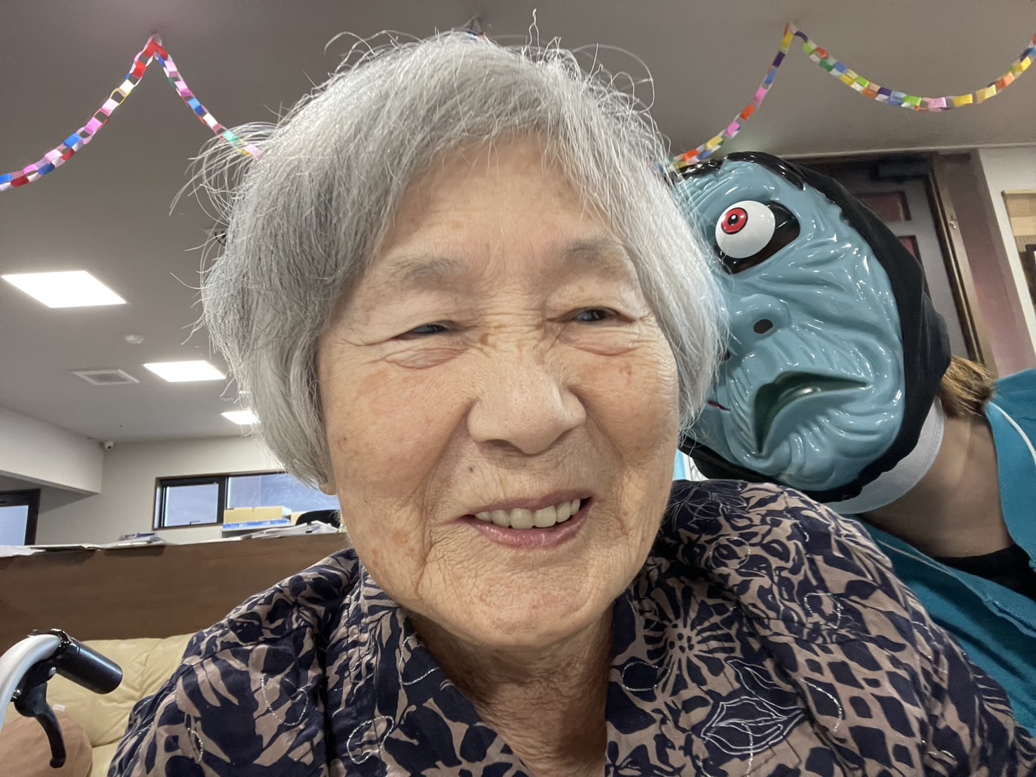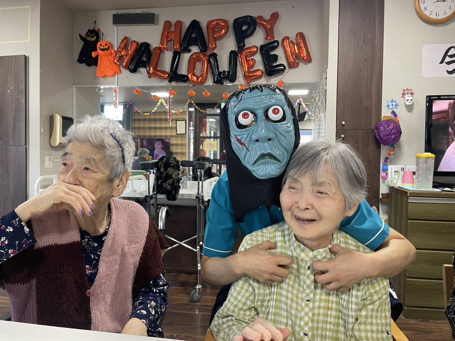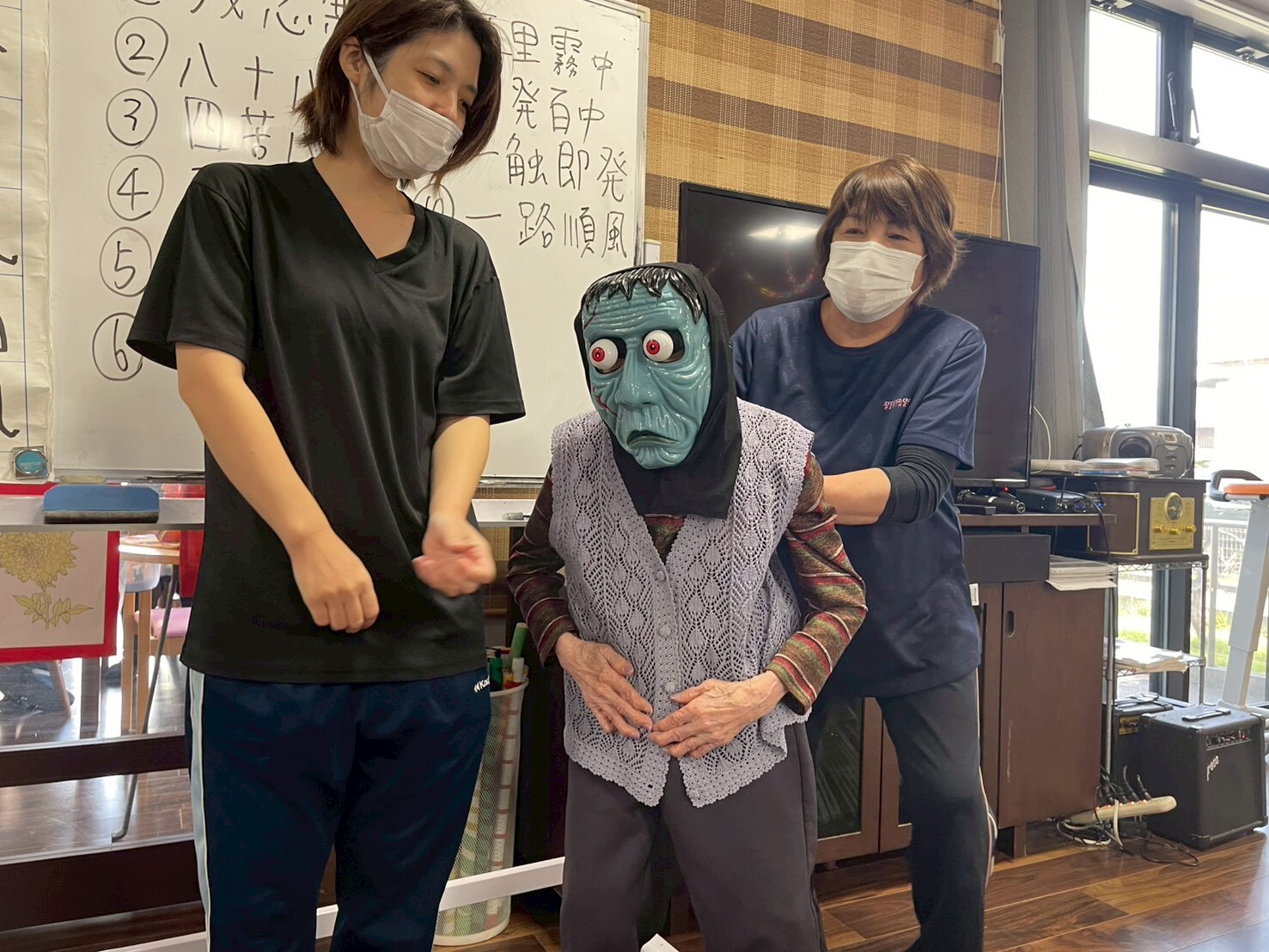 お次はデイスタッフによる出し物二人羽織でした。定番のお化粧を塗ってもらい美人にしてもらおうかと思ったら化け物になってしまいましたね。皆さんから悲鳴が聞こえたり「もっと上ー!」「そこじゃないよー!」と声が聞こえてとても盛り上がりました。